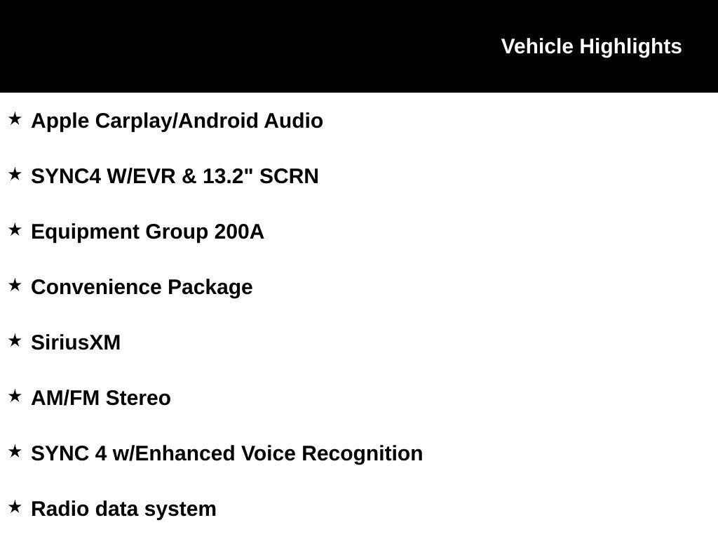 - SYNC 4 w/Enhanced Voice Recognition -inc: 13.2" LCD capacitive touchscreen in center stack w/swipe capability, cloud connected, 911 Assist, wireless Apple CarPlay and Android Auto compatibility, digital owners manual and conversational voice command recognition