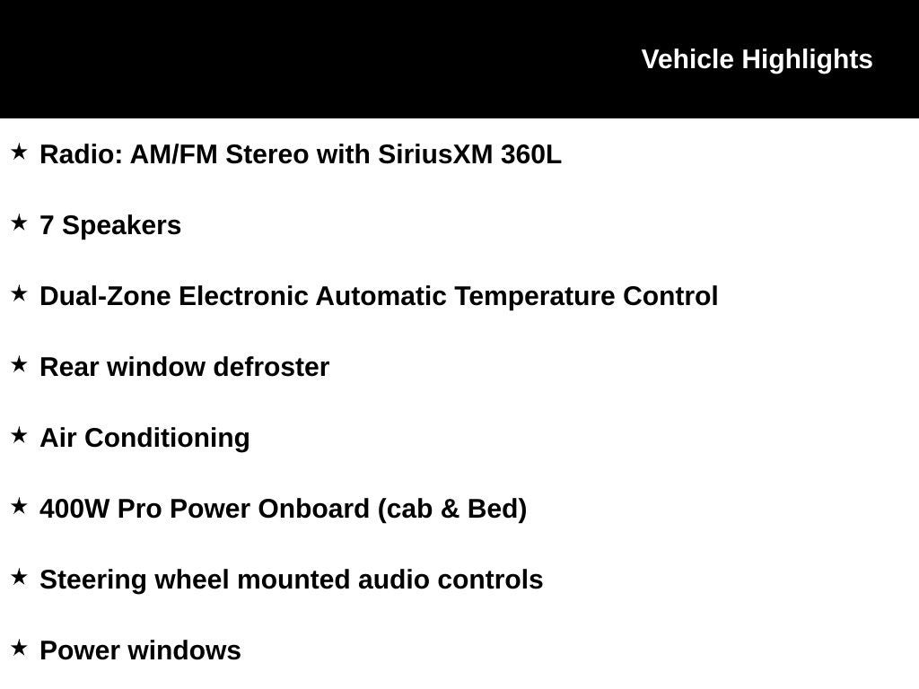 Elevate your driving experience with the F-150's impressive array of advanced features, including Adaptive Cruise Control, Ford Co-Pilot360 Assist 2.0, and a 360-degree camera system. Stay connected and entertained with the SYNC 4 infotainment system, while the power-sliding rear window and 400W Pro Power Onboard provide added versatility.