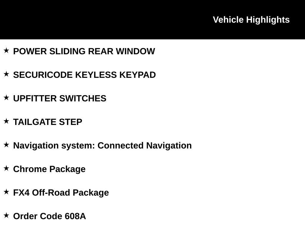 The FX4 Off-Road Package further enhances the vehicle's versatility, equipping it with specialized shock absorbers, electronic-locking differential, and upfitter switches for seamless customization. Indulge in the unparalleled convenience of the Ford Connectivity Package, providing a 1-year subscription to keep you connected on the go.